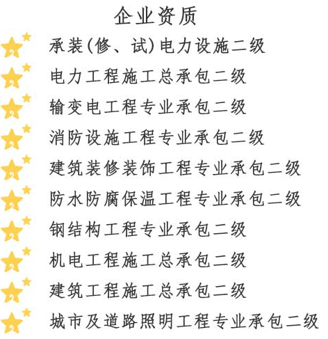 金楓電力集團有限公司,成立于2015年5月28日,注冊資金6060萬元,是一家專業(yè)從事電力工程施工的集團化公司。公司經(jīng)營范圍包括:電氣安裝服務;建設工程施工;輸電、供電、受電電力設施的安裝、維修和試驗;測繪服務;建筑勞務分包;建筑工程設計;發(fā)電機及發(fā)電機組制造;建筑工程機械與設備租賃;工業(yè)工程設計服務;技術服務、技術開發(fā)、技術咨詢、技術交流、技術轉(zhuǎn)讓、技術推廣等。公司持有國家能源局頒發(fā)的承裝(修、試)電力設施許可證,承裝類二級、承修類二級、承試類二級資質(zhì);電力工程施工總承包二級資質(zhì);輸變電工程專業(yè)承包二級資質(zhì);建筑裝修裝飾工程專業(yè)承包二級資質(zhì);消防設施工程專業(yè)承包二級資質(zhì);防水防腐保溫工程專業(yè)承包二級資質(zhì);施工勞務資質(zhì);機電工程施工總承包二級;建筑工程施工總承包二級;城市及道路照明工程專業(yè)承包二級;鋼結(jié)構(gòu)工程專業(yè)承包二級資質(zhì);公司已通過質(zhì)量管理體系認證、環(huán)境管理體系認證及職業(yè)健康安全管理體系認證。并獲得省級信用評價AAA證書;連續(xù)多年納稅信用評價A級。